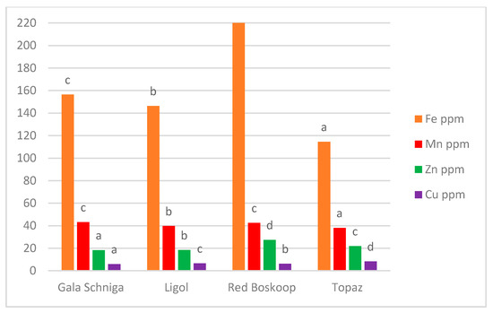 A comparison of the content of micronutrients in leaves of maiden apple trees depending on the variety used. Data followed by the same letters do not differ significantly at p = 0.05 for each micronutrient according to Tukey’s test.