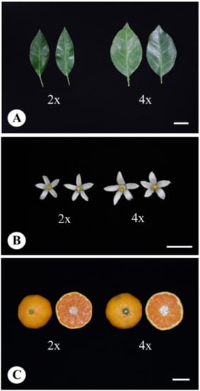 The morphological characteristics of leaves (A), flowers (B) and fruits (C) in diploid and tetraploid Satsuma mandarin. (Bar = 3 cm).