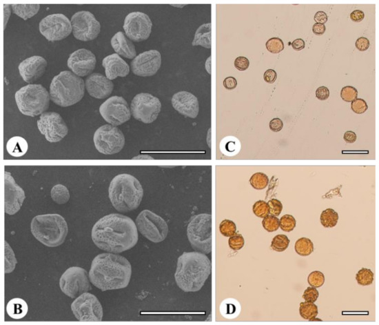 Scanning electron micrographs (A,B; Bars = 50 μm) and stainability by 1% acetocarmine (C,D; Bars = 50 μm) in pollen of diploid (A,C) and tetraploid (B,D) Satsuma mandarin.
