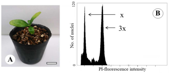 A seedling obtained from the cross between the tetraploid Satsuma mandarin and ‘Banpeiyu’ pummelo (A, Bar = 3 cm) and its flow cytometry analysis (B). x: Haploid pummelo as an internal standard, 3x: A triploid seedling obtained from the cross between the tetraploid Satsuma mandarin and ‘Banpeiyu’ pummelo.