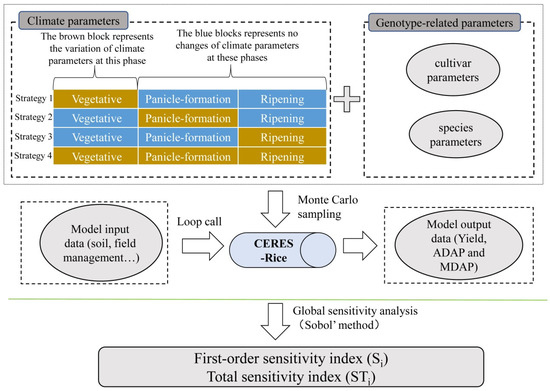 Typical workflow for global SA across 30 cultivars in the CERES-Rice model. Strategy 1–4 represent the variations of climate parameters at vegetative phase, panicle-formation phase, ripening phase, and the whole growth season, respectively.