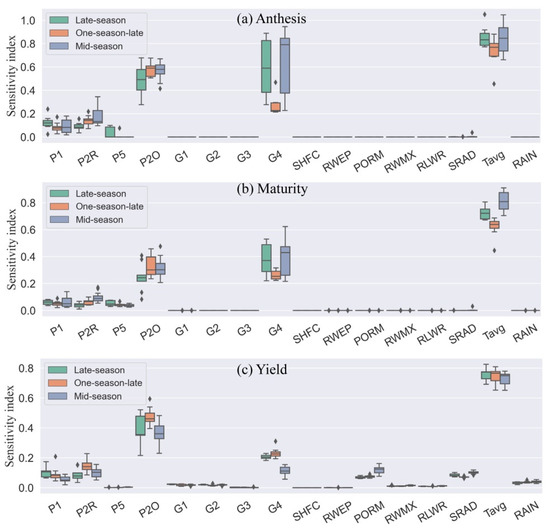 For both ADAP and MDAP, parameters P2O, G4, Tavg were more influential than other parameters among different cultivar types (Figure 2). G4 in late-season and mid-season cultivars showed larger inter-cultivar variability than that in one-season-late cultivars. Tavg had the largest influence on values for phenology in all cultivars. For yield, parameters Tavg and P2O had a markedly larger influence and inter-cultivar variability. The variations of values were similar in different cultivar types. In general, the more influential parameters (Tavg and P2O) showed a more evident difference between cultivars.