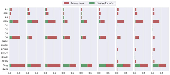 The mean first order index () and interactions under different cultivar types under variation of climate parameters at the vegetative phase. The bottom title of each subfigure shows the SA for specific outputs (ADAP, MDAP, and yield) under different cultivar types.