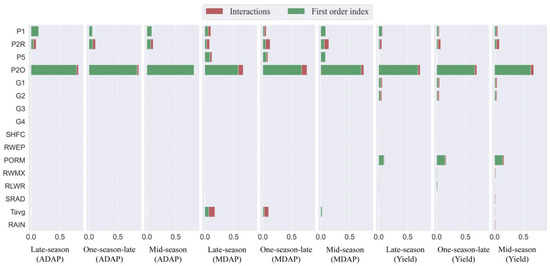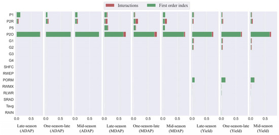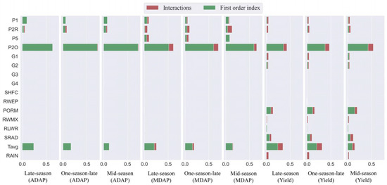 The mean first order index () and interactions under different cultivar types under variation of climate parameters at the ripening phase. The bottom title of each subfigure shows the SA for specific outputs (ADAP, MDAP, and yield) under different cultivar types.