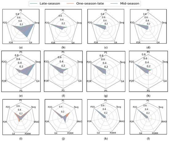 Table 5 shows the values of under the different cultivar types. The different cultivars in the same cultivar type had no noticeable effect on the parameter ranking for the model outputs. The values were larger than 0.93 for all output variables. Additionally, the values in different cultivar types were greater than 0.98 for all output variables. The corresponding p-values are not presented in this study but were less than 0.05. In general, different cultivars had no statistical influence on the rankings of the sensitivity parameters.