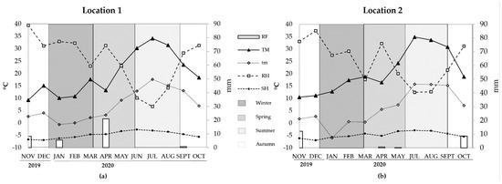 Weather parameters from November (2019) to October (2020). (a): Location 1; (b): Location 2. Main axis: absolute maximum temperature (TM; °C) and absolute minimum temperature (tm; °C). Secondary axis: rainfall (RF; mm), relative humidity (RH; %) and sunshine hours (SH; h).