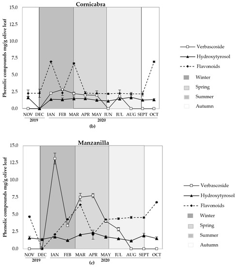 Evolution of several phenolic compounds (mg/g) of olive leaves during an agronomic cycle (November 2019 to October 2020). (a) Picual; (b) Cornicabra; (c) Manzanilla.