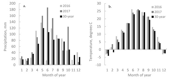 Monthly precipitation (a) and average temperature (b) at Lincoln, NE in 2016, 2017, and from 1988–2017 (i.e., 30-year average).