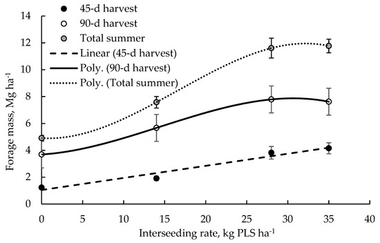 Forage mass responses to seeding rate depended on the harvest. A positive linear forage mass response at 45 d after interseeding indicates that seeding at the highest rate of 35 kg ha−1 would result in earlier forage availability. However, cubic forage mass responses to seeding rate at 90 d after interseeding and in the summer total of the 45 and 90 d harvests indicate that producers can produce similar forage by interseeding at 28 kg ha−1. At 28 kg ha−1, forage accumulation summed across the 45 and 90 d harvests in sorghum-sudangrass interseeded sod exceeded that in unseeded sod by 136% (Figure 2; 11.61 and 4.91 Mg ha−1). At the other eastern Nebraska location (i.e., Mead), smooth bromegrass interseeded with sorghum-sudangrass at 42 kg ha−1 had 102% greater forage accumulation than unseeded smooth bromegrass in 2016 [8] and comparable dry matter yields (10.54 and 5.22 Mg ha−1, respectively) to our study when harvested twice at 45 and 90 d after interseeding, despite the greater seeding rate (i.e., 1.5 times conventional seeding rate of 28 kg ha−1) and seedling emergence percentage.