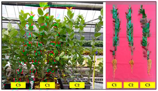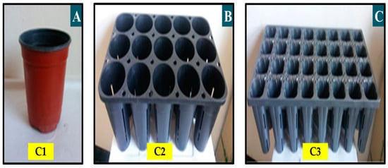 In Experiment 2, we focused on three different container sizes C1, C2 and C3 to improve plant growth of tissue culture propagated apple plant (Figure 5). Plant height in C1 size container was 6% and 12% significantly taller than those grown in C2 and C3 containers, respectively (Figure 6A). Information about the apple rootstock’s response in different container sizes is still lacking. However, other researchers carried out experiments on the effect of container size on different tree and vegetable plants. Parkia biglobosa seedlings at ten weeks after treatment showed that plant height was taller in bigger-sized pots than those grown in a small-sized pot []. The plant height of sixteen-week-old Eucalyptus citriodora Hook seedlings was significantly taller in larger pot (5 L) compared with those grown in small pot (1 L) [].