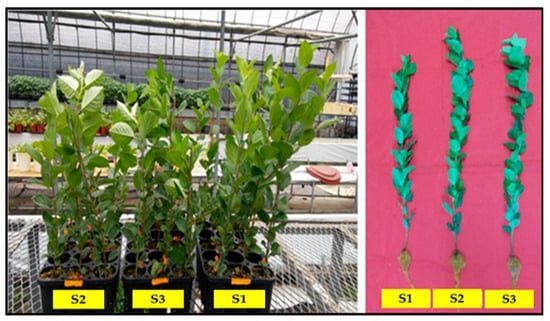 Container size is another factor for plant growth and development in nurseries. It facilitates above and below ground biomass production. A plant’s photosynthesis also depends on container size and how long the plant remains in a container []. In addition, container size regulates the root growth of plants. Furthermore, plant physiology and shoot growth greatly depend on root growth and metabolic activities of a plant []. Particularly, container size is a vital factor for apple plants, because its rootstock is grown in a small pot and remains in a nursery long term before transplanting.
