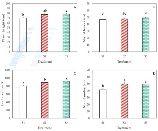 Effect of substrate composition on plant height (A), leaf number (B), leaf area (C) and node number (D) of M-9 apple rootstock plant at 11 weeks after treatment in a greenhouse. S1, S2 and S3 indicate 1:1:1, 1:2:3, and 3:1:2 ratio of peat moss: vermiculite: perlite, respectively. Lines above the bar represent the standard error of the mean (n = 5). Means above each bar followed by the same letters are not significantly different with Duncan’s multiple range test (DMRT) at p ≤ 0.05.