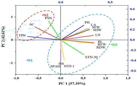 Principal component analysis (PCA) illustrates the variable treatment relationships among the three treatments of M-9 apple rootstock plant at 11 weeks after in a greenhouse. S1, S2 and S3 indicate 1:1:1, 1:2:3, and 3:1:2 ratio of peat moss: vermiculite: perlite, respectively. The lines starting from the central point of the biplots display the negative or positive associations of the different variables, and their proximity specifies the degree of correlation with specific treatment. PH, plant height; LN, leaf number; LA, leaf area; NN, node number; RL, root length; STD-1, stem diameter from 1 cm of ground; STD-30, stem diameter from 30 cm of ground; SFW, shoot fresh weight; RFW, root fresh weight; SDW, shoot dry weight; RDW, root dry weight; SPAD, SPAD value; PSN, photosynthesis rate; SC, stomatal conductance and TPN, transpiration rate.