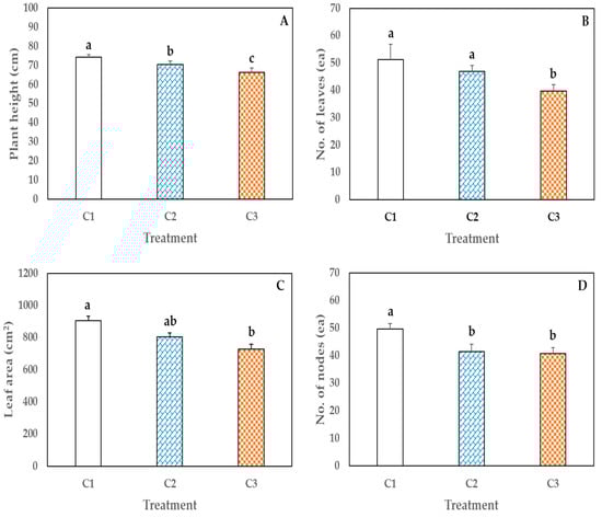 The number of leaves was 9% higher in C1 plants than those grown in C2 (Figure 6B). In addition, C1 treatment showed a 29% higher number of leaves than those grown in the C3 container. Leaf area in C1-treated plants was 12% significantly higher than C2-treated plants and 24% higher than C3-treated plants (Figure 6C). The node number of C1-treated plants was 20% significantly higher than those grown in C2 and C3 treatment (Figure 6D).