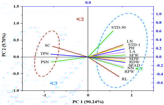 Principal component analysis (PCA) illustrates the variable treatment relationships among the three treatments of M-9 apple rootstock plant at 11 weeks after in a greenhouse. C1, C2 and C3 indicate container sizes of 1000 mL, 500 mL and 300 mL, respectively. The lines starting from the central point of the biplots display the negative or positive associations of the different variables, and their proximity specifies the degree of correlation with specific treatment. PH, plant height; LN, leaf number; LA, leaf area; NN, node number; RL, root length; STD-1, stem diameter from 1 cm of ground; STD-30, stem diameter from 30 cm of ground; SFW, shoot fresh weight; RFW, root fresh weight; SDW, shoot dry weight; RDW, root dry weight; SPAD, SPAD value; PSN, photosynthesis rate; SC, stomatal conductance and TPN, transpiration rate.