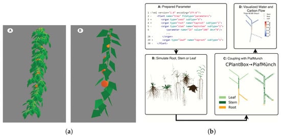 AMAPsim model output (a) and CPlantBox framework (b). (a) 3D output of AMAPsim model. Tomato plant modeled with complete shape (A) and simplified leaves shape (B), Barczi et al. [], with permission from Oxford University Press, 2021 license 5200260057623; (b) major steps, as flow chart, in CPlantBox framework coupled with PiafMunch. Zhou et al. [] 2020. Published by Oxford University Press on behalf of the Annals of Botany Company. Distributed under the terms of the Creative Commons Attribution License (http://creativecommons.org/licenses/by/4.0/, 28 September 2021).