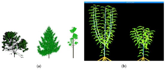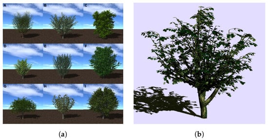 (a) Different 3D trees generated with procedural tree generation plug-in in Helios. Copyright © 2019 Bailey []. Distributed under the terms of the Creative Commons Attribution License (CC BY). (b) GroIMP application on a 3D generated maple tree. Reproduced with Creative Commons Attribution-NonCommercial-NoDerivs 3.0 Netherlands from Kniemeyer et al. [].