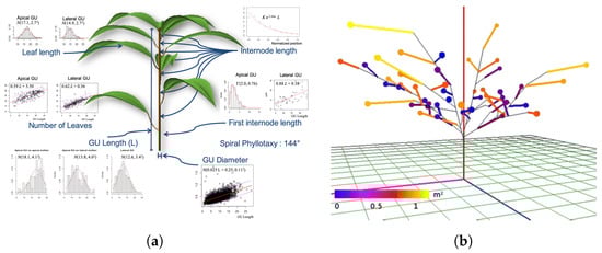 An example of the application of FSPM as an agronomic tool for crop practice design is V-MANGO proposed by Boudon et al. []. The model is based on a representative FSPM of the mango tree (Mangifera indica L.) that reproduces the vegetative and reproductive development of the tree and their interactions. The main goal of the authors has been to create an integrative FSPM model of mango tree development and fruit production to demonstrate that an FSPM can be used to formalize the development of the complex architecture of mango trees also phenologically, to show how the introduction of some temporal and structural factors can simulate the complex interactions between vegetative and reproductive growth, to create a first basis for a model that can be used for the design of cultural practices. V-MANGO is based on the architecture model proposed by Hallè el al. [], described as a series of growth units, inflorescences and fruits organized as an arborescent structure. Growth units are composed of a series of internodes and leaves organized in a spiral pattern. Boudon el al. [] modeled several sub-models to integrate these different scales and combined them consistently. A plant architecture model was first defined simulating the visual part of the different entities (growth units and inflorescence) by decomposing morphogenesis into elementary stochastic processes. Growth unit geometry is defined by several variables such as axis length and diameter, number of leaves, leaf length, width and area, internode length, and phyllotaxis (see Figure 4a). Using all of these parameters, the authors have been able to accurately represent the geometry and location of each individual growth unit. All these growth unit, fruit, and inflorescence models have been assembled by the authors into a complete architecture using an L-Py [] module of the OpenaAlea [] platform, using L-system formalism with the Python language. The visualization of the structure is then entrusted to the L-system formalism and rules. Although V-MANGO is a complete FPSM, which models both the structural and functional part of the mango tree and has as output a 3D structure of the tree, it has further integrations and updates to be implemented, according to the authors. The 3D structure generated by V-MANGO lacks a module to calculate the amount of intercepted light, and the introduction of this module would allow a more accurate calculation of photosynthesis in fruit production. Finally, the introduction of modules that take into account agronomic practices, such as pruning, would allow the V-MANGO model to be used as a tool for precision agriculture.