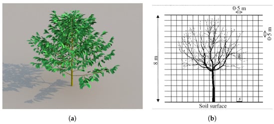 (a) Coffee tree simulated in ARCHIMED with XPlo AMAPstudio’s module and Sunflow integrated renderer; (b) walnut tree structure with division in 3D cells made by RATP model, Sinoquet et al. [], with permission from John Wiley and Sons, 2021 license 5200250775819.