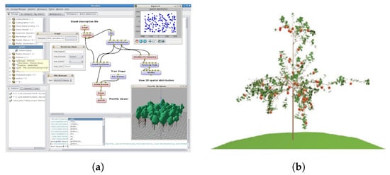 (a) Overview of OpenALEA software interface with dataflow and interconnectind nodes. On the lower right, the 3D viewer is shown. Screenshot from software. Main research by Pradal et al. []. (b) A five-year-old apple tree modeled with MAppleT. Adapted from Costes et al. [] with permission from CSIRO Publishing, 2021 license 1165429-1.