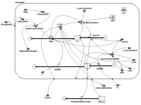 The mathematical model is a set of ordinary differential equations able to simulate the internode elongation and the rules for stopping growth. The internode elongation is a function of environmental parameters (temperature and light) and some species parameters (growth rate and max length). Stopping rules of internode growth are simulated according to the concentration of an inhibitory substance produced during the internode elongation. Internodes grow until a given inhibitor concentration is reached; then, the tree enters a seasonal growth stop and starts growing again after the inhibitor concentration reaches a minimum (Figure 7). Restarting the growth, the system will generate one or more branches depending on the species-specific parameters set. Figure 8 shows the stock and flow model representation in the system dynamics tool Simile [].