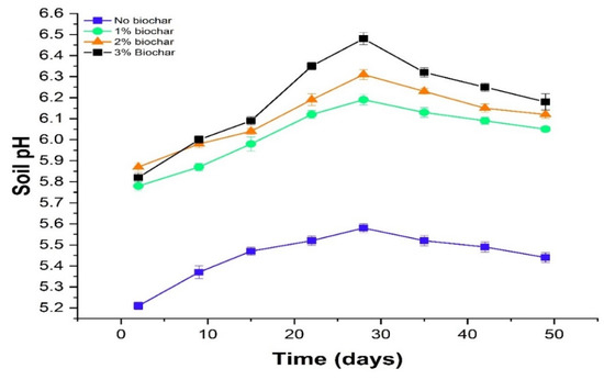Biochar application significantly (p ≤ 0.01) affected the soil pH during the study period. However, the application of 3% biochar significantly increased the soil pH by 13.78% compared to the control (Figure 1). The biochar application (3%) increased the soil pH from 5.21 to 5.82 on day two, and afterward, pH showed an increasing trend up to 28 days, where pH reached the maximum value (6.48). Moreover, after 28 days, soil pH in biochar treated and control showed a decreasing trend until the end of the study (Figure 1).
