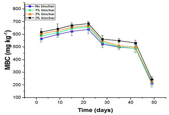 Biochar application significantly (p ≤ 0.01) affected the microbial biomass carbon (MBC) contents (Figure 2). A significant increase of 11.08% in MBC was noted with biochar addition compared to control (Figure 2). The increase in biochar application rate significantly increased the soil MBC (Figure 2). Soil MBC showed an increasing trend until day 22, with a maximum MBC (685 mg kg−1) recorded on day 22 with 3% biochar rate; after that, 2% biochar rate (669 mg kg−1), and a lowest MBC (639 mg kg−1) was recorded in control (Figure 2). After 22 days, soil MBC showed a decrease until the end of the study period (Figure 2).