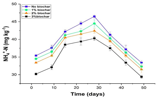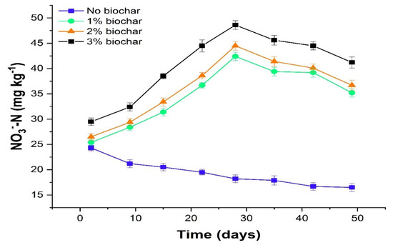 Soil NH4+-N content was markedly (p ≤ 0.01) influenced by diverse rates of biochar (Figure 3). The application of biochar increased the NH+4-N contents by 17.48% compared to control (Figure 3). The NH+4-N concentration at day 2 in control, 1%, 2%, and 3% biochar remained as 35.4, 34.5, 33.4, and 30.2 mg kg−1; however, after day 2 biochar application favored the significant reduction in NH4+-N concentration until day 28. On day 28, maximum NH4+-N concentration (46.5 mg kg−1) was noted in no-biochar addition; after that, 1% biochar and lowest NH4+-N concentration (42.4 mg kg−1) was noted in 3% biochar rate (Figure 3). Moreover, after 28 days, soil NH4+-N showed a declining trend in control and biochar-treated soils. Biochar application significantly (p ≤ 0.01) increased the soil NO3−-N concentration. However, this increase was the maximum with a higher rate of biochar application (3%) compared to control and 1% and 2% biochar rate (Figure 4). In control soil, NO3−-N concentration showed a decreasing trend from start to end. While in biochar application, NO3−-N concentration showed an increasing trend from day 2 until day 28, and after soil NO3−-N concentration was consistently decreased in biochar-treated soil until the end of the study (Figure 4). The overall trend of soil NO3−-N concentration for biochar application was recorded as: 3% > 2% > 1% > control (Figure 4).