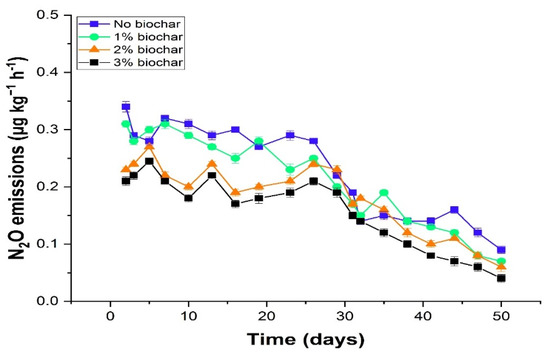 Soil pH is the most important factor that affects the N2O emission from soils [5]. Thus, altering soil pH triggers not only the various soil biochemical processes but also affects soil health and N2O emission [33]. Biochar addition significantly augmented the soil pH (Figure 1). However, the application of biochar (3%) significantly increased the soil pH compared to 1% and 2% biochar application and control (Figure 1). The increase in soil pH altered the soil microbe’s activity and regulated the microbial N availability, therefore affecting the soil N2O emission [34]. The N2O emissions in the current study were negatively associated with soil pH, and the application of 3% substantially increased soil pH and resulted in minimum N2O emissions (Figure 5). Higher soil pH suppresses NR activity that converts the NO3− into NO2 [35]. Indeed, rice residue biochar expressively reduced NR activity, particularly at a 3% biochar rate, and enhanced the NO3− and decreased the NO2 and consequently N2O emission. Therefore, biochar-induced augmentation in soil pH is a possible mechanism for reducing N2O emissions from acidic soils [1].