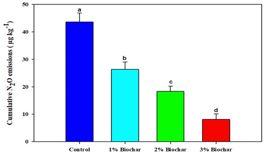 Biochar application had a significant (p ≤ 0.01) impact on soil N2O emissions (Figure 5). N2O emissions were significantly higher in control; after that, 1% and 2% biochar application and the lowest N2O emission was recorded in 3% biochar application (Figure 5). The application of 3% biochar markedly reduced the N2O emission by 462% compared to control. Moreover, the highest N2O emission (0.34 µ g kg−1 ha−1) was recorded on day 2 in the control soil; after that, 1% biochar and 2% and 3% application (Figure 5). After day 2 N2O emissions showed an inconsistent trend until the end of the study period. The 3% biochar application remained the most effective, and it significantly reduced the N2O emissions compared to the 1% and 2% biochar rate and control (Figure 5). The biochar application also reduced the cumulative N2O emission compared to control (Figure 6). The highest cumulative N2O emission was recorded in control (no biochar), while the lowest N2O emission was recorded in soil treated with 3% biochar (Figure 6). The application of 3% biochar reduced N2O emissions by 462%, whereas 2% biochar and 1% biochar application reduced the N2O emissions by 225% and 113% compared to control (Figure 6).