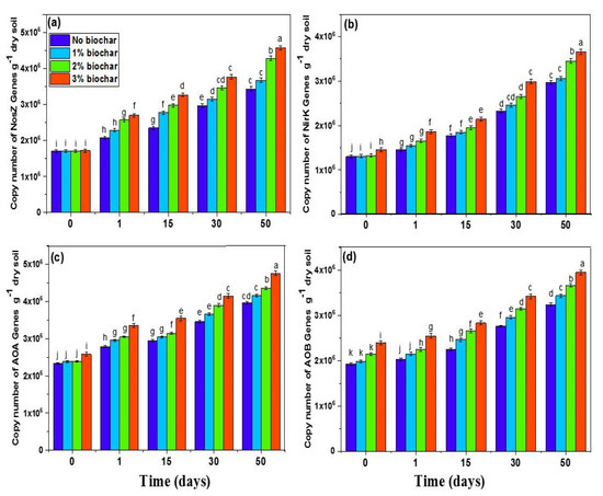 Biochar application showed a significant (p ≤ 0.01) positive influence on nitrous oxide reductase (nosZ), nitrite reductase (nirK), ammonia-oxidizing archaea (AOA), and ammonia-oxidizing bacteria (AOB) abundance during the study period (Figure 7). At the start of the study, there was no significant difference in genes abundance for control and biochar treated soils (Figure 7). Overall, maximum nosZ and nirK genes during the study period were recorded in soil treated with 3% biochar; after that, 2% biochar and the lowest number of both nosZ and nirK genes were recorded in control (Figure 7a,b).