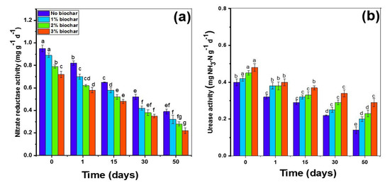 The activities of both enzymes nitrate reductase (NR) and urease (UR) were significantly (p ≤ 0.01) different among control and biochar amended soils (Figure 8). Biochar application significantly inhibited the activity of NR by 32% during the study period compared to control (Figure 8a). However, it was dose-dependent, and a higher rate of biochar (3%) considerably inhibited the NR activity compared with the 1% and 2% biochar rate and control (Figure 8a). The NR activity was found maximum at the start of the study control soil, and after that, 1%, 2%, and 3% biochar rate; after that, NR activity showed a consistent decrease until day 45, whereas again, the maximum NR activity was noted in control and the lowest NR activity was noted in 3% biochar rate (Figure 8a). Conversely, the addition of different biochar rates improved the UR activity by 18.24% compared to control (Figure 8b). The maximum UR activity (0.48 NH3-N g−1 d−1) was recorded at the start of the study in soil treated with 3% biochar; after that, 2% biochar treated soil, and the lowest UR activity (0.4 NH3-N g−1 d−1) was recorded in control. After that, UR activity showed a decreasing trend in both biochar amended soils and control (Figure 8b).