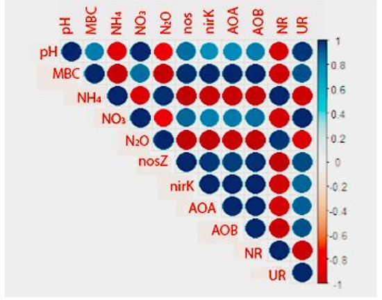 The data were subjected to Pearson’s correlation analysis to determine the relationship between different studied traits (Figure 9). Soil N2O emission was positively linked with NH4+-N contents; however, N2O emissions were negatively linked with soil pH, NO3−-N, genes abundance, and NR activity. Moreover, a strong positive correlation was noted between N2O emissions and NH4 contents, whereas a strong negative association was recorded between N2O emission and soil pH, NO3, genes abundance, and NR activity (Figure 9).