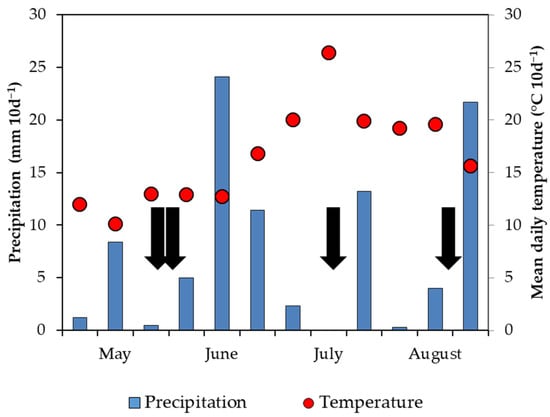 Climate data for the vegetation period 2019 in Shortandy, Kazakhstan. The cumulative precipitation and mean daily temperature are given in 10-day intervals. Samplings are indicated by vertical black arrows.