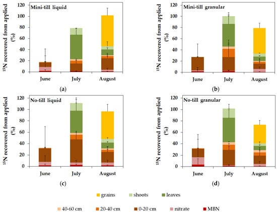 Recovery of applied 15N in soil and plant compartments over the vegetation period for the treatment combinations: (a) mini-till liquid, (b) mini-till granular, (c) no-till liquid, and (d) no-till granular. All data values are the means of n = 3 subplots. Error bars represent the standard deviation and are displayed on top of each bar to provide a better readability.