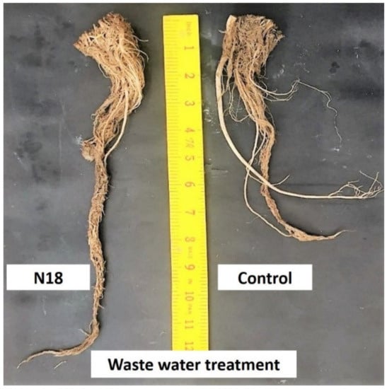 The spinach plants treated with treated wastewater reported a maximum increase in root fresh and dry weight compared to mixed and canal water treatments (Figure 2 and Table 4). In treated wastewater treatment, a maximum increase of 28.7% in root fresh weight and 29.8% in root dry weight of spinach was reported by Bacillus sp. (N18) compared to the uninoculated control. Similarly, this strain also produced a maximum increase of up to 26.0% in root fresh weight and 25.8% in root dry weight of spinach over the uninoculated control plants treated with mixed water.