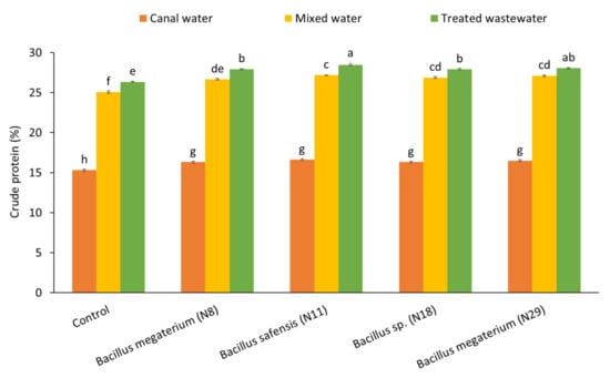 The maximum crude protein contents with an increase of 8% were observed from treated wastewater by inoculation of B. safensis (N11) and were non-significant with B. megaterium (N29) (Figure 3). The inoculation with B. safensis (N11) showed 8.4% more crude protein contents and was nonsignificant to Bacillus sp. (N18) and B. megaterium (N29) under nixed water treatment.