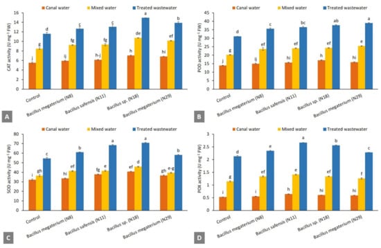 Effect of Pb-tolerant Bacillus strains on antioxidant enzymes: Catalase activity (A); Guaiacol peroxidase activity (B); Superoxide dismutase activity (C); and Peroxidase activity (D) of spinach plants under wastewater, mixed water, canal water conditions in pot trial; (n = 4); Bars sharing different letters are statistically significant from each other at 5% level of probability; CAT = Catalase; POD = Guaiacol peroxidase; SOD = Superoxide dismutase; POX = Peroxidase.