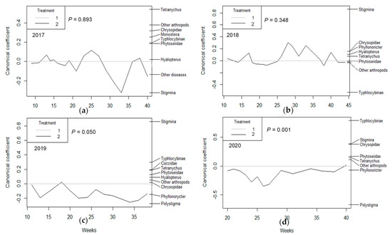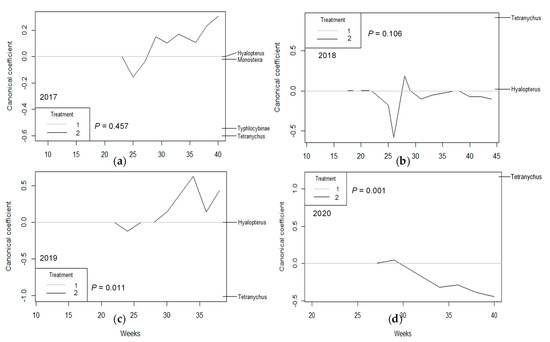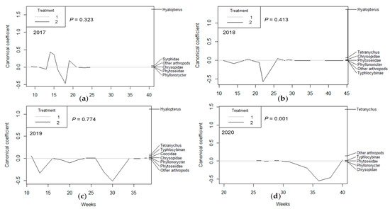 Principal response curves (PRCs) for the most important arthropod taxa whose population density was evaluated on almond shoots for (a) 2017, (b) 2018, (c) 2019, and (d) 2020. The p values denote the significance of treatment T2 (RDI), represented as a plotted line, relative to control treatment on all dates based on an F−type permutation test. Arthropod taxa are shown on the right vertical axis with their weights, which have the same scale as canonical coefficients on the left vertical axis.