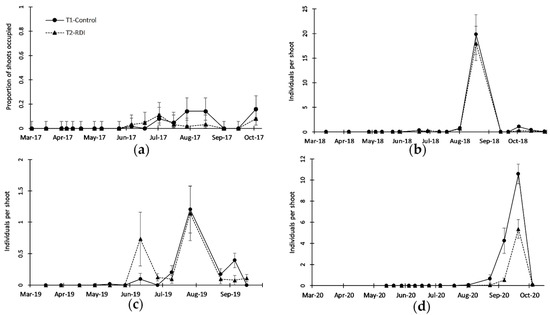 Seasonal patterns of Tetranychus urticae as (a) proportion of shoots occupied (2017) and (b–d) population density in shoots (2018, 2019, and 2020, respectively). Note the different y-scales. Solid line represents treatment T1 (Control) and dotted line represents treatment T2 (RDI). Vertical bars represent exact confidence interval of proportion (a) and standard error of the mean (b–d).