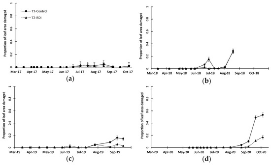 Seasonal patterns of Tetranychus urticae damage on leaves, measured as the proportion of leaf area with feeding symptoms for (a) 2017, (b) 2018, (c) 2019, and (d) 2020. Solid line represents treatment T1 (Control) and dotted line represents treatment T2 (RDI). Vertical bars represent standard error of the mean.