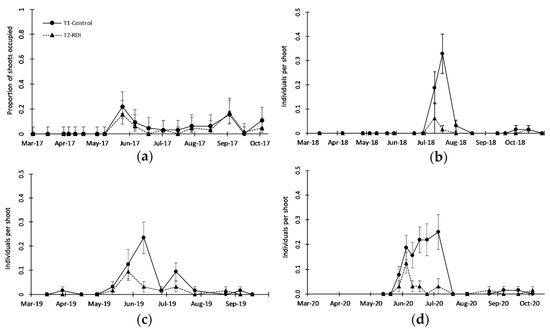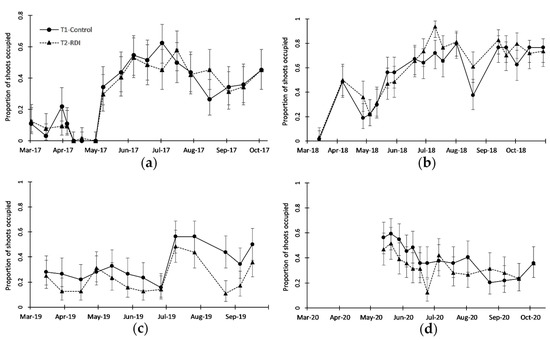Seasonal patterns of leafhoppers (Typhlocybinae) in terms of (a) proportion of shoots occupied in 2017 and (b–d) population density on shoots in 2018, 2019 and 2020, respectively. Solid line represents treatment T1 (Control) and dotted line represents treatment T2 (RDI). Vertical bars represent exact confidence interval of (a) proportion and (b–d) standard error of the mean.