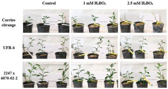 Plant symptoms of the three citrus rootstocks (Carrizo citrange, UFR-6 and 2247 x 6070-02-2) under three boron treatments (Control, 1 mM H3BO3 and 2.5 mM H3BO3) at the end of the experiment (21 days).