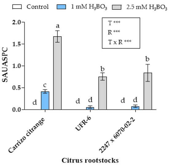 All citrus rootstocks displayed different response. Hence, the highest significant response of SAUASPC was obtained with Carrizo citrange plants under a 2.5 mM H3BO3 treatment. The SAUASPC response was similar for UFR-6 and 2247 x 6070-02-2 under the highest toxicity concentration and was statistically lower compared with the Carrizo citrange and the same treatment. For 1 mM H3BO3, SAUASPC response in all citrus rootstocks was significantly lower compared with the results at 2.5 mM H3BO3. Carrizo citrange showed the highest value for 1 mM H3BO3, with statistical differences compared with the two other citrus rootstocks under the same concentration and with its control. However, UFR-6 and 2247 x 6070-02-2 displayed similar SAUASPC values without significant differences against control treatments (Figure 2).