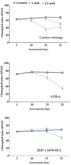 Carrizo citrange showed similar SPAD values at the first assessment timing for all treatments. However, the 2.5 mM H3BO3 treatment showed a slight reduction at the D10, decreasing with the lowest SPAD values down to D15, whereas boron treatment of 1 mM H3BO3 displayed a similar SPAD response to Control until D15. At D21, plants from 1 mM H3BO3 treatment had reduced SPAD values, and plants treated with 2.5 mM H3BO3 had slightly increased SPAD values with a similar response to 1 mM. In the case of UFR-6, a similar SPAD response was found for all treatments until D10. Plants of this citrus rootstock decreased their SPAD values after D15 with the lowest response at D21. Treatment 1 mM H3BO3 maintained a similar response to Control plants throughout the assay. Lastly, 2247 x 6070-02-2 displayed a similar SPAD response for all treatments from D1 to 15. Plants of this citrus rootstock had only reduced SPAD response at D21 with the highest concentration treatment (Figure 3).