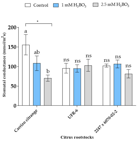 Mean stomatal conductance (mmol/m2s) at the end of the experiment with three boron toxicity treatments (Control, 1 mM H3BO3 and 2.5 mM H3BO3) and using three citrus rootstocks (Carrizo citrange, UFR-6 and 2247 x 6070-02-2). Values in columns with different letters means statistical differences among the treatments per each rootstock by Fisher LSD test (p < 0.05). Significant codes: * = p < 0.05; ns: non-significant differences.