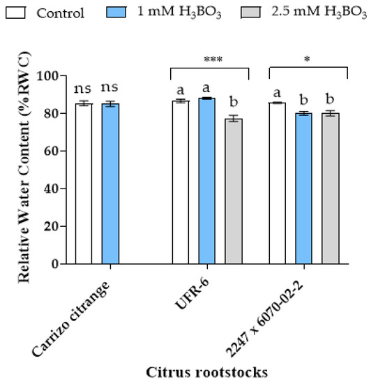 Relative Water Content (RWC) at day 21 of the assay in three citrus rootstocks studied (Carrizo citrange, UFR-6 and 2247 x 6070-02-2) and under three boron toxicity treatments (Control, 1 mM H3BO3, and 2.5 mM H3BO3). Values in columns with different letters means statistical differences among treatments for each citrus rootstock by Fisher LSD test (p < 0.05). 2.5 mM H3BO3 treatment of Carrizo citrange: data not available. Significant codes: * = p < 0.05, and *** = p < 0.001; ns: non-significant differences.