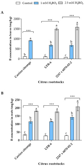 The increase in B concentration in leaves for all citrus rootstocks was directly proportional to B toxicity treatments. Carrizo citrange displayed the highest B concentration values in leaves at 1 mM H3BO3 treatment with statistical differences compared with its control treatment. UFR-6 displayed the highest B concentration at 2.5 mM H3BO3 treatment, with significant differences among 1 mM H3BO3 and Control treatment. 2247 x 6070-02-2 displayed the highest B concentration in leaves at 2.5 mM H3BO3 treatment, followed by 1 mM H3BO3 and Control, with significant differences among all treatments assayed (Figure 6A).