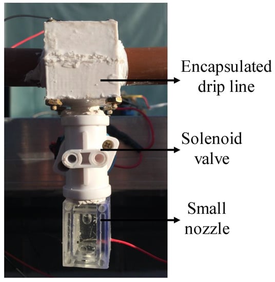 The new VRDI design (Figure 1) controls the water application at the point of delivery. The prototype consists of a custom piece that encapsulates a drip line with an integrated tortuous path to reduce pressure, an electronic solenoid valve (DC12V G 1/4″ Electric Solenoid Valve N/C Feed for RO Water Air Quick Connector from HongQin Water purification Equipment Factory) to regulate the flow, a small nozzle, two wire leads, and circuitry to connect and control the components (DCCDuino Nano and STP16NF06 N MOSFET, 60V, 16A, GDS Newark, NJ, USA) (Figure 2). The VRDI design was created with the Autodesk Fusion model 360 software, and the plastic (ABS) components were 3D printed (FUSION3 F410 and Resins Architecture Industry Form3 SLA 3D Printer by Formlabs, Preform). The physical dimensions of the plastic components were selected to match a standard ¾″ dripline and the inlet on an off-the-shelf solenoid valve (DC12V G 1/4″ Electric Solenoid Valve N/C Feed for RO Water Air Quick Connector from HongQin Water purification Equipment Factory). The tortuous path geometry was determined experimentally through trial and error by adding additional length and tortuosity to the path until drops, rather than a stream, exited the emitter. The emitter was secured to the drip lines using four screws and silicon to prevent water leaks (Figure 1). The small nozzle was designed such that it forms water drops of known and constant diameter. Each drop connects two electric leads (normally separated by an air gap) as it is falling. An electric circuit is closed when the drop passes between the leads. The electric circuitry keeps a running count of the number of times the circuit is closed, which is equal to the number of water drops applied. A control value is actuated to cease the flow when the total volume (number of drops times water volume per drop) reaches the desired water application volume. The full system was designed to increase the precision of water application by literally counting the water drops applied and only applying the number specified to be the water manager. Here, a water manager can be a person, an electronic control system, or a sensor(s) that monitors components of the agricultural system. A photo of the built prototype is shown in Figure 1.
