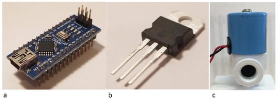 Electronic components: (a) DCCDuino Nano Nano, (b) 16NF06 N MOSFET, (c) Solenoid electronic valve.